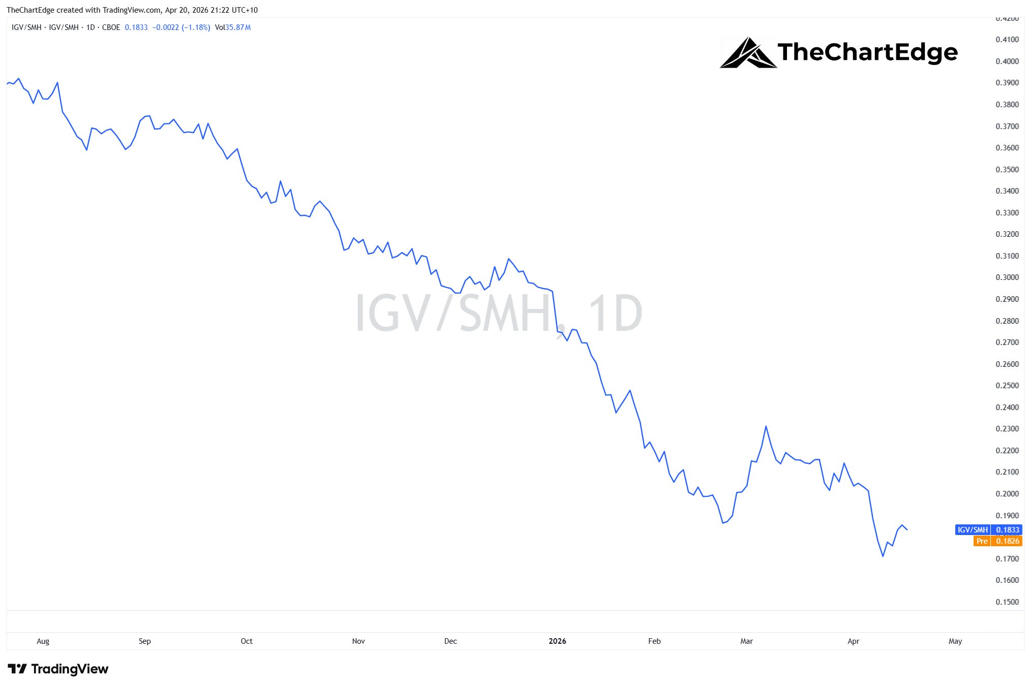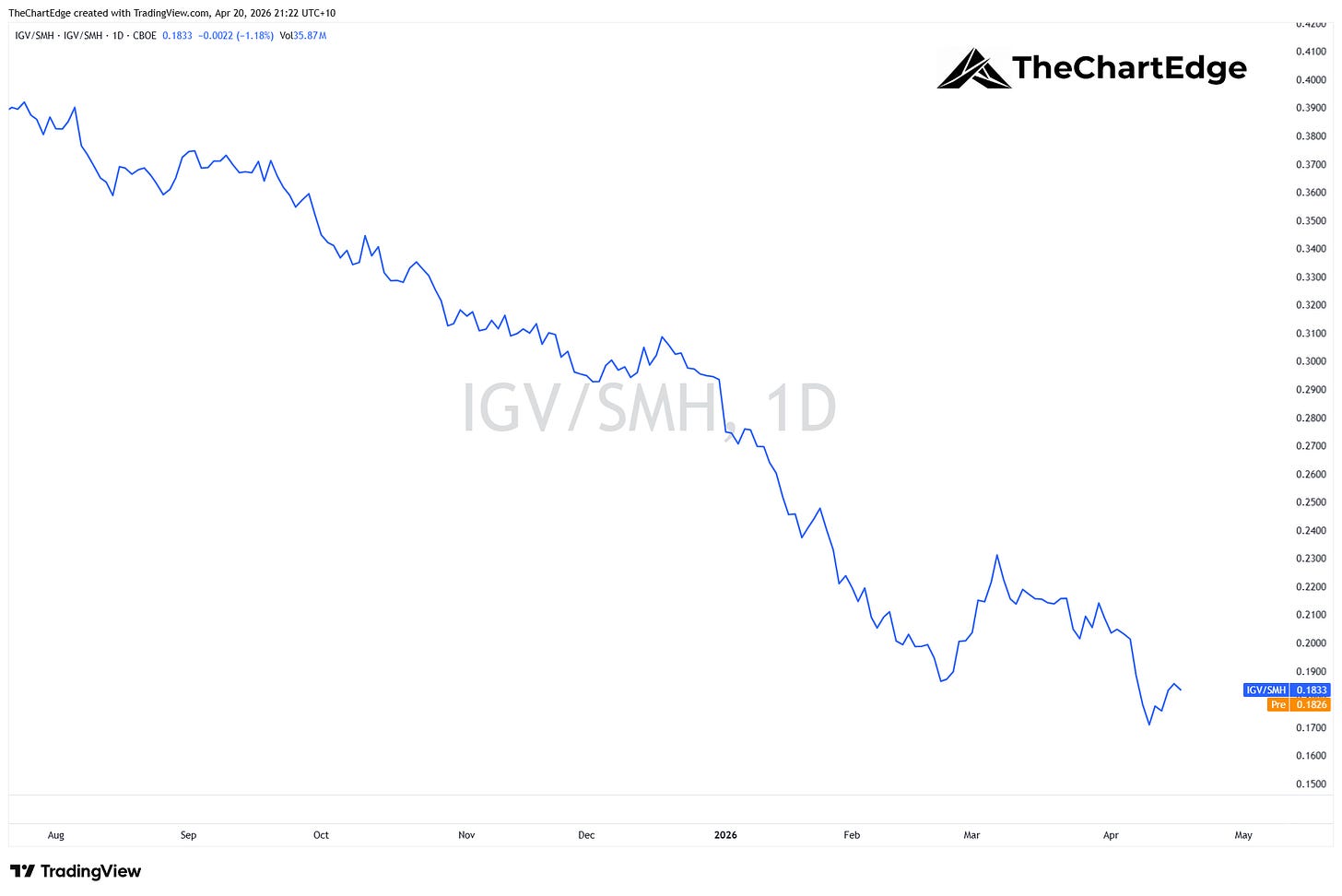 IGV (the Software ETF) gained 13.94% and has just crossed into the Improving quadrant - but only barely. The gap between hardware and software in relative strength terms remains extreme - around 40 points. If I plot IGV relative to SMH, it’s still in a clear downtrend and has barely moved on this bounce. One week doesn’t change a trend. This is one to watch for confirmation over the coming weeks, not to act on prematurely. Lets see.