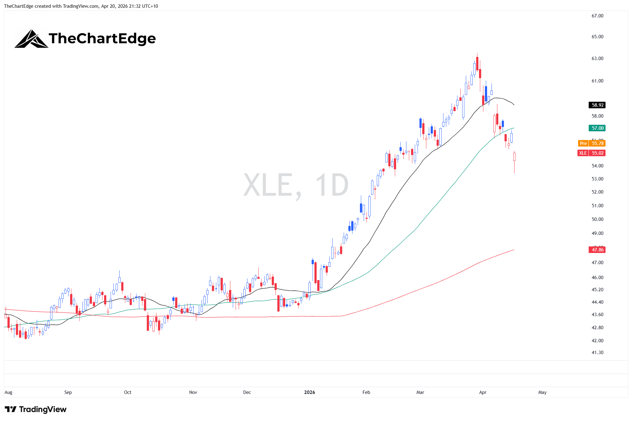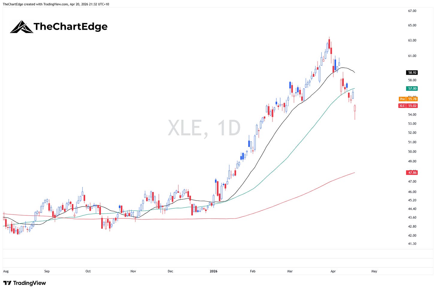 Energy is where the rotation is clearly moving away from. XLE was down 3.37% in a week where SPY gained over 4.5%. XOP dropped 5.21% and USO fell 7.03%. The momentum picture across the energy complex has weakened sharply. The longer-term trend is still positive, but the gap between energy and the rest of the market widened significantly last week.