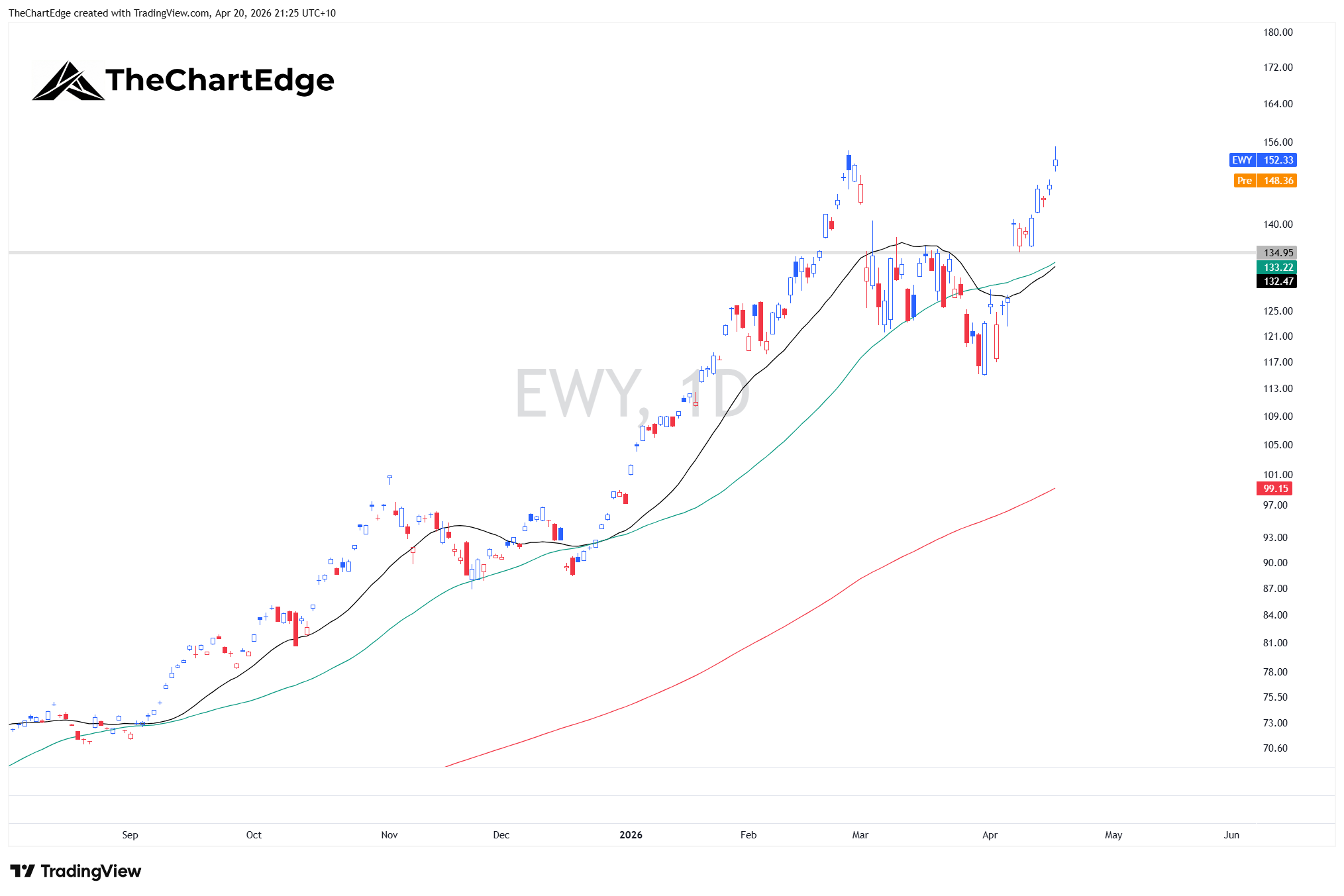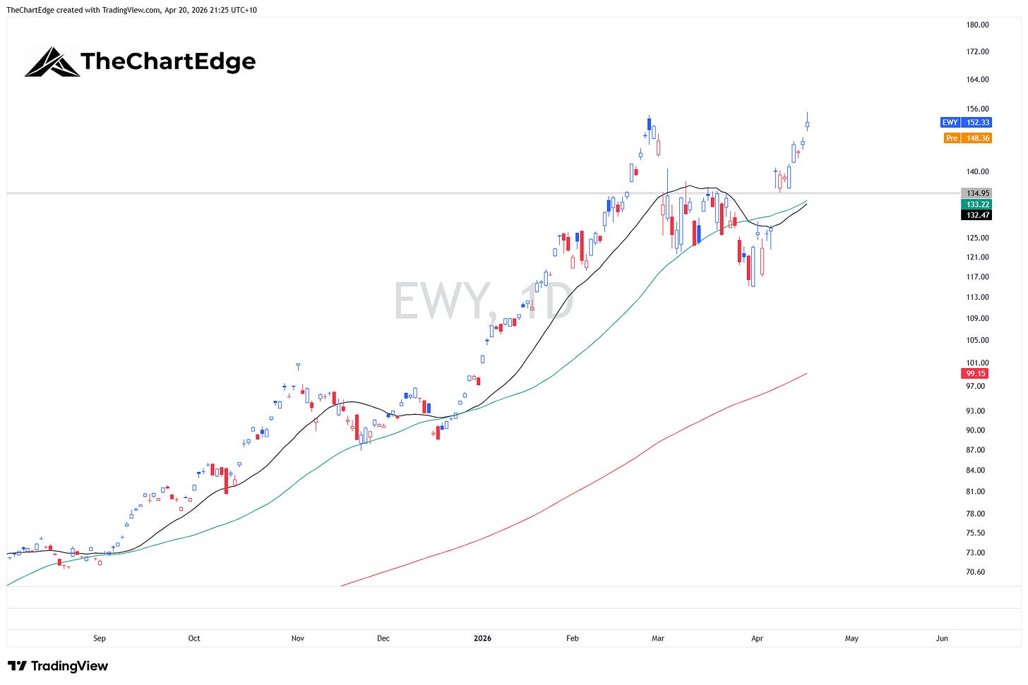 South Korea (EWY) deserves a mention. It has the highest relative strength trend reading in the entire 121-ETF universe. That’s not entirely surprising given its heavy semiconductor exposure (Samsung, SK Hynix), but it’s worth noting as an alternative way to play the global chip cycle.