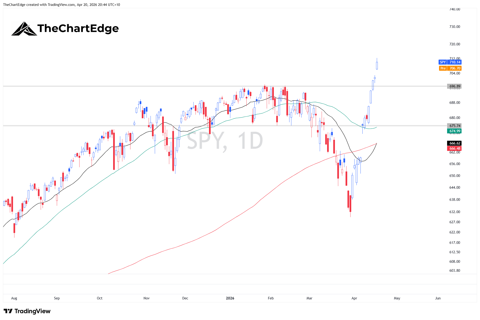 The Tape pillar is the strongest contributor. Participation is confirming the price move, and that matters a lot. Around 69% of US stocks are now trading above their 50-day moving average, up sharply from recent lows, and the weekly RSI on SPY has swung from 45.9 to 63.0 in just two weeks.